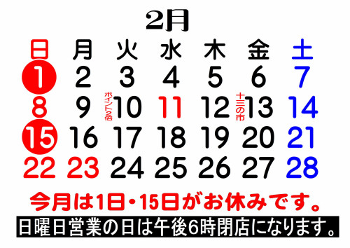 - 2月のお休みです。(カレンダー参照)2026-01-29 に