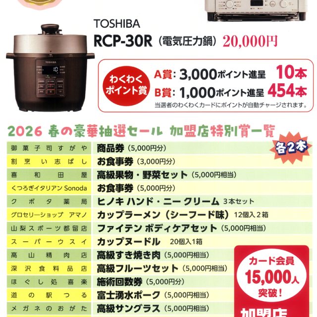 2026年3月1日~3月31日の期間中に、加盟店でお買い物金額500円以上をポイント払いすると自動応募・自動抽選で景品(商品)が500本当たるセールです。(ポイント払いにも、ポイントをお店で付与します。)■ ポイント払い500ポイント毎に1...